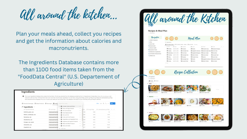 ✨With a user-friendly interface, the Health & Happiness template enables effortless monitoring of your Food Intake. It features a vast database of over 1100 pre-installed food items, sourced from the reputable "FoodData Central" by the U.S. Department of Agriculture. Get detailed nutritional information, track calories, carbohydrates, fat, and protein, and make informed dietary choices.